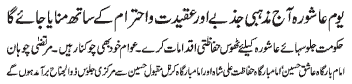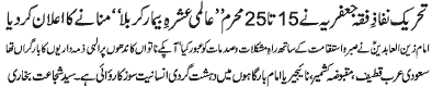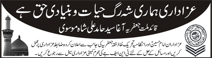 ISLAMABAD, November 8: TNFJ announced the observation of Aalmi Ashrae Beemar e Karbala (PBUH) from 15-25 Muharram |