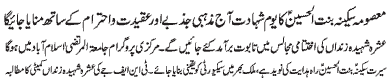 ISLAMABAD, November 29: The martyrdom anniversary of Hazrat Sakina (PBUH) will be observed with great religious zeal and reverence |