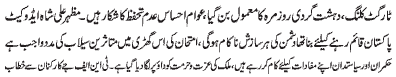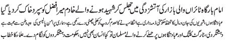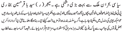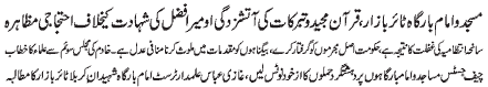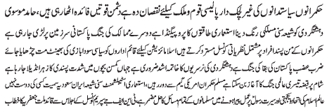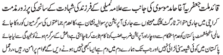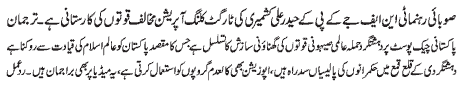 | ISLAMABAD, September 18: The murder of the leader of TNFJ KPK Haider Ali Kashmiri is the heinous act of the anti operation forces | |||