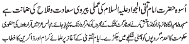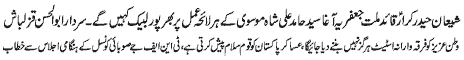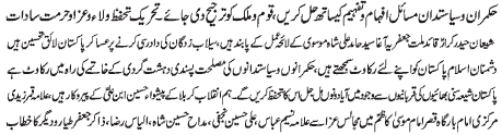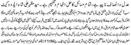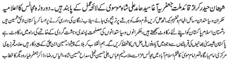 ISLAMABAD, September 15: Shiane Haidere Karar will follow the call of the Quaid e Millat e Jafariya Agha Syed Hamid Ali Shah Moosavi - Qamar Zaidi |
