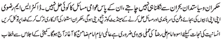 ISLAMABAD, September 4: The rulers and the politicians do not want to solve their issues; they do not have solutions of the public problems - Dr Rizvi |