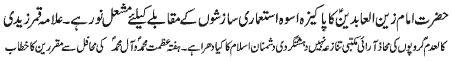ISLAMABAD, March 8: The pious character of Imam Zainal Abidin (PBUH) is a beacon of light to fight back the colonial conspiracies - Qamar Zaidi |