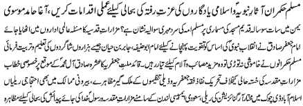 | ISLAMABAD, August 14: The Muslim States should accept Pakistan’s leadership as an atomic power if they desire to save themselves | |||