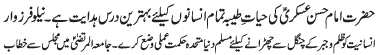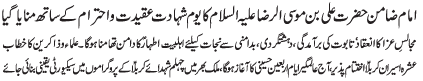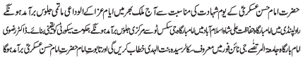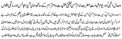 | RAWALPINDI, December 12: Wisal of Paighambar-e-Akram (SAAW) and Shahadat of Imam Hassan (A.S.) was observed throughout the country with respect | |||