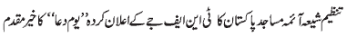 ISLAMABAD, June 26: On the call of the TNFJ, the second Friday of Ramzan will be observed as Youm e Dua |