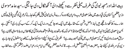 | ISLAMABAD, April 14: Every honourable Muslim believe in defending the Bait Allah, Masjid Nabvi and the holy places - Hamid Moosavi | |||