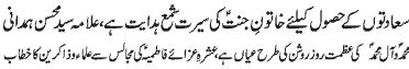 | ISLAMABAD, March 20: The pious character of Hazrat Fatima is the complete code of life for women to follow - Qamar Zaidi | |||