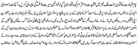 ISLAMABAD, April 11: The Youm-e-Wiladat Purnoor of Khatoon-e-Jannat Hazrat Fatima Zehra (S.A.) was observed throughout the country |