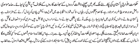 ISLAMABAD, May 18: The government should listen to the armed forces and should take actions against the facilitators of the terrorists - Hamid Moosavi |