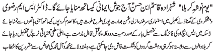 ISLAMABAD, May 26: The birth anniversary of Shahzada Qasim Bin Hassan (PBUH) will be celebrated with great religious zeal |