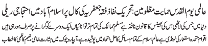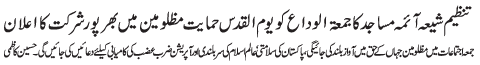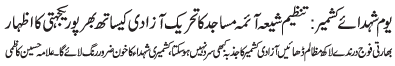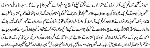 | ISLAMABAD, July 15: Youm-e-Shuhada-e-Kashmir will observed on Friday 15th July to express solidarity with the freedom lovers of Kashmir | |||