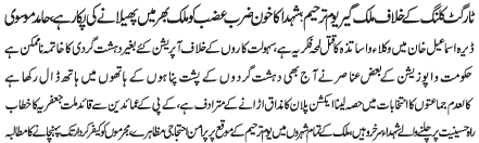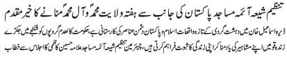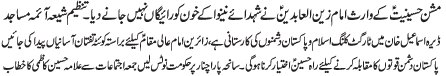 ISLAMABAD, May 8: Moosavi condemns incidents of target killing in D.I.Khan, Peshawar, Karachi, and other parts of the country |
