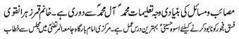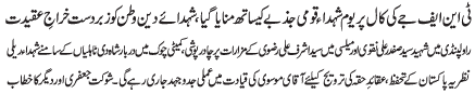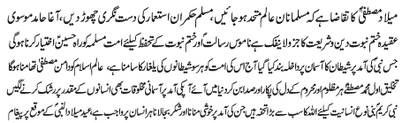 ISLAMABAD, November 5: The belief of Khatam e Nabuwat is ones essence of belief; thw whole nation will sacrifice everything for the motherland - Sakhawat Hussain Kazmi |
