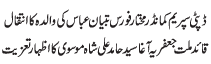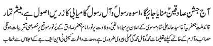 ISLAMABAD, November 6: Today Jashan e Sadqaen (A.S) will be celebrated today; life of Aale Rasool is a golden step towards success - Mesum Tamar |