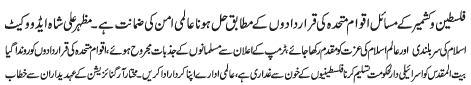 ISLAMABAD, December 9: Finding solution of the issues of Kashmir and Palestine as per the UNO resolutions guarantees world's peace - Mazhar Shah |