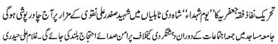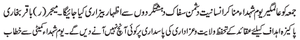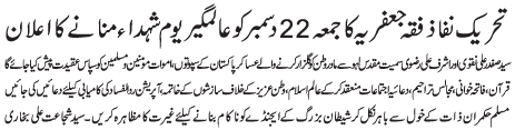 ISLAMABAD, December 21: While observing Alamgheer Youme Shuhada on Friday, terrorists will be condemned - Major (R) Baqir Bukhari |
