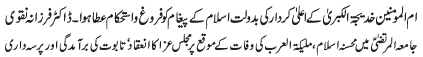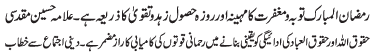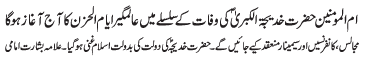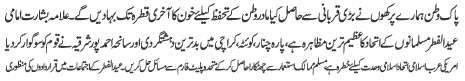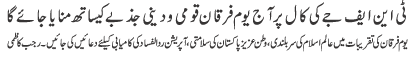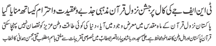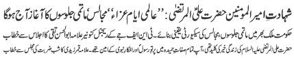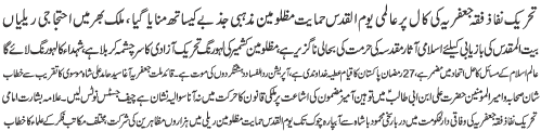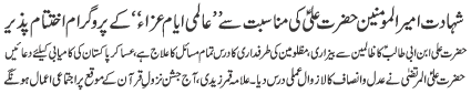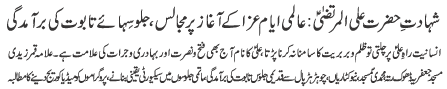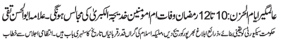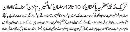 ISLAMABAD, June 2: TNFJ announced the observation of Aalmgheer Ayyamal Huzn from 10 to 12 Ramzan al Kareem |