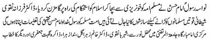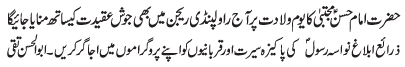 | RAWALPINDI, June 12: The birth anniversary of Imam Hassan (A.S) was celebrated with great respect and reverence | |||