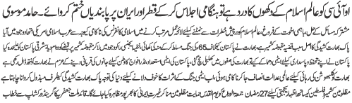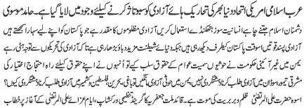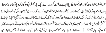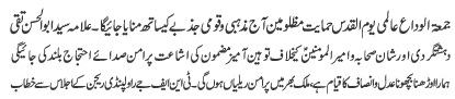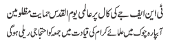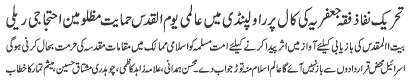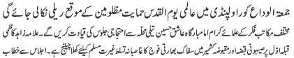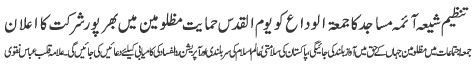 ISLAMABAD, June 21: On Jumatul Wida the Youmal Quds Hamaeyet Mazloomeen will be observed and peaceful protests will be held against oppression and terrorism - Messam e Tamaar |