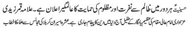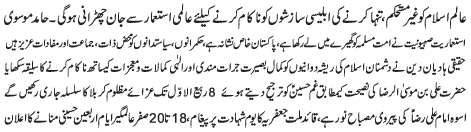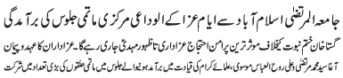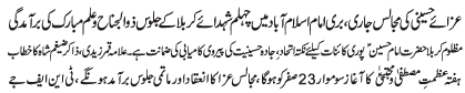 | ISLAMABAD, November 26: Azadari is the most effective peaceful protest and will be continued until the zahoor of Imam e Zaman (A.S) - Hamid Moosavi | |||