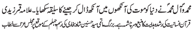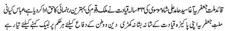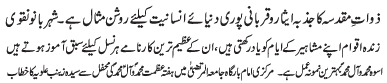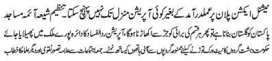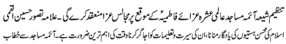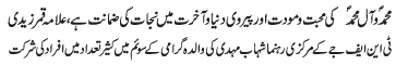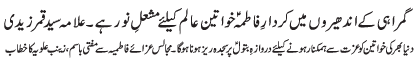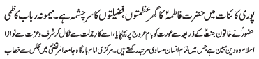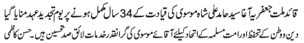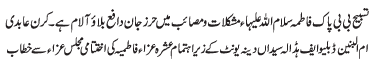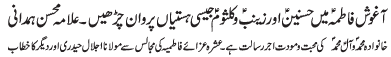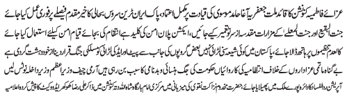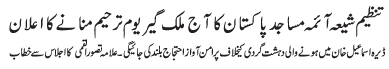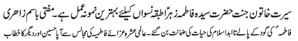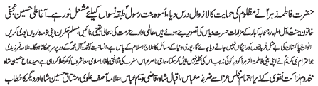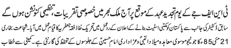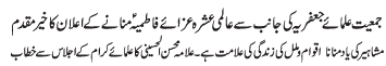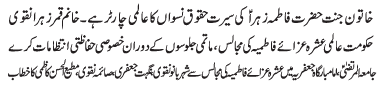 | ISLAMABAD, February 11: TNFJ announced the observation of the "Aalmi Ashrae Azae Fatimiya" from 24 Jamadiul Awwal to 3rd Jamadiul Thani | |||