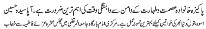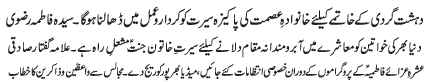 | ISLAMABAD, February 17: In order to root out terrorism, the pious character of the Holy family of the Prophethood must be adopted - Syeda Fatima Rizvi | |||