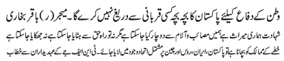 RAWALPINDI, January 6: For the defence of the motherland, every child of Pakistan will make any sacrifice Major (R) Baqir Bukhari |