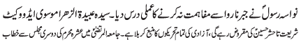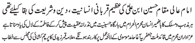 | ISLAMABAD, September 24: Hussain (AS) belongs to all; TNFJ appreciate efforts of all for the peaceful observation of first ten days of Muharram | |||