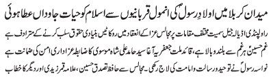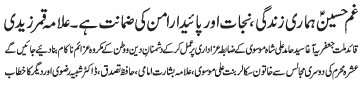 RAWALPINDI, September 14: The mourning for Imam Hussain (AS) guarantees our salvation and provides long lasting peace - Qamar Zaidi |