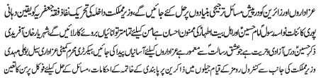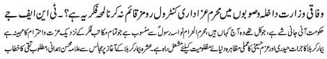 | ISLAMABAD, September 19: The problems of the mourners of Imam e Mazloom (AS) will be solved on priority basis - Assurance of the minister of interior Shehryar Khan Afridi | |||