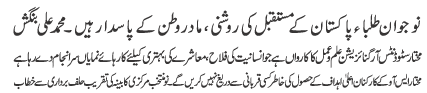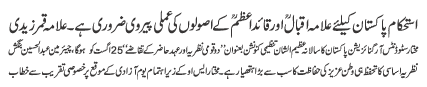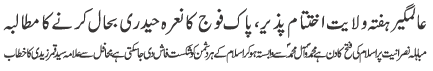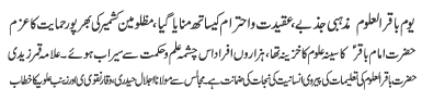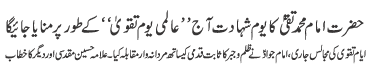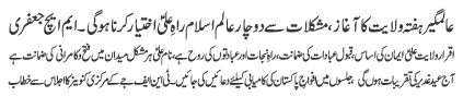 | ISLAMABAD, August 20: The "Aalmgheer Hafta e Walayat" commences; Muslim world surrounded by difficulties have to adopt the Path of Imam Ali (AS) - M H Jafferi | |||