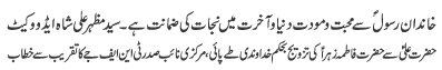 | ISLAMABAD, August 4: Expressing love towards the family of the Prophethood guarantees salvation of this world and the hereafter - Mazhar Shah | |||