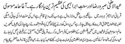 | ISLAMABAD, August 12: Eidul Azha is the great remembrance of patience, acceptance and the tradition of Hazrat Ibrahim - Hamid Moosavi | |||