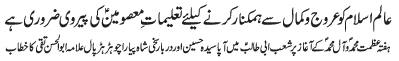 ISLAMABAD, January 30 : During Ashra e Aza e Fatimiya security of Majalis and Matami processions must be ensured - TNFJ |