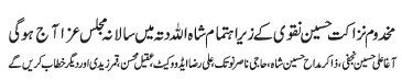 | ISLAMABAD, January 12: On the call of the TNFJ Mahafil Meelad and Conferences held on the commencement of Ayyam e Aqeela e Bani Hashim (SA) | |||