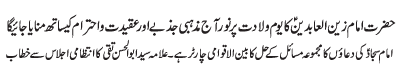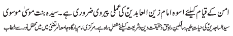 ISLAMABAD, January 22: The patience and forbearance of Hazrat Imam Zainal Abideen (AS) is the shinning example for humanity to follow - Allama Basharat Imami |