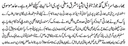 | ISLAMABAD, March 2: By responding to the Indian aggression through Zarb e Haidery, the courageous armed forces of Pakistan have given a mouth breaking blow to the coward enemy India - Hamid Moosavi | |||