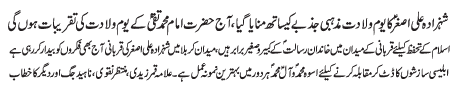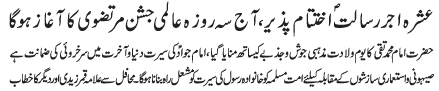 | ISLAMABAD, March 9: The Wiladat e Purnoor of Imam Mohammad Baqir (AS) will be celebrated Today with great zeal and reverence | |||