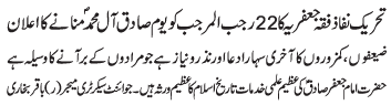 ISLAMABAD, March 25: The TNFJ announced the observation of the “Youm-e-Sadiq” on Sunday, 22 Rajab |