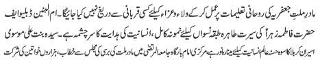 | ISLAMABAD, May 16: The life of Ummal Momineen Hazrat Khadijatul Kubra (SA) is the best example for married women - Allama Basharat Imami | |||