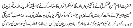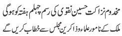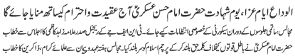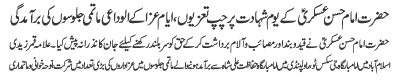 | ISLAMABAD, November 6: In connection with the Shahadat of Imam Hassan Al Askari (AS) Matami Processions will be held throughout the country | |||