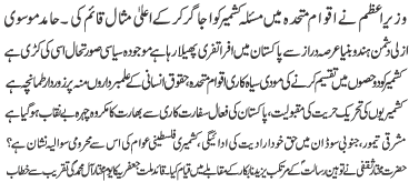 | ISLAMABAD, November 23: To resolve Kashmir issue government should dispatch representative delegations to other countries so that world opinion can be taken into confidence on the matter - Hamid Moosavi | |||