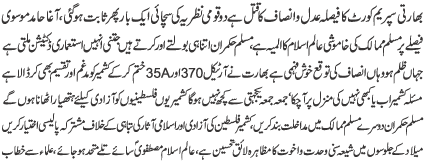 | ISLAMABAD, November 21: The evil powers are united against Muslims but the Muslim rulers and the international organizations are silent on the matter - Shuja'at Bukhari | |||