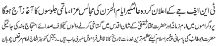 | ISLAMABAD, November 19: The Tehreek Nafaz e Fiqh e Jafariya niminated the conveners to oversee the programs of Aalmgheer Ayyam ul Huzn | |||