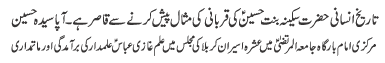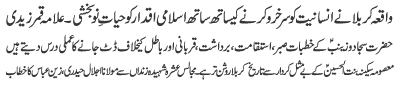 | RAWALPINDI, October 3: The tragedy of Karbala not only increased the honour of Humanity but also gave eternal life to the Islamic values - Qamar Zaidi | |||