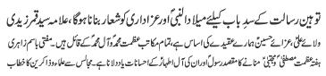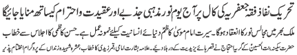 | ISLAMABAD, October 30: Tehreek Nafaz e Fiqh e Jafariya announced the observation of Haftae Ehad O Peyman from 1-8 Rabiul Awwal | |||