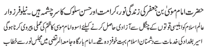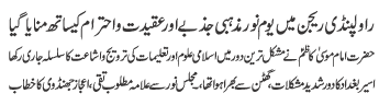 | ISLAMABAD, October 7: On the call of Tehreek Nafaz e Fiqh e Jafariya, today Youm e Noor will be observed with great religious zeal and reverence | |||