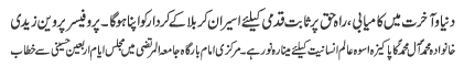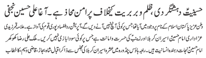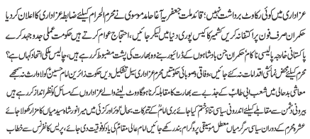 | ISLAMABAD, September 1: No hurdle will be allowed in Azadari, the Quaid-i-Millat Jafariya Agha Syed Hamid Ali Shah Moosavi has announced 16-point Code of Azadari for the oncoming Muharramul Haram | |||