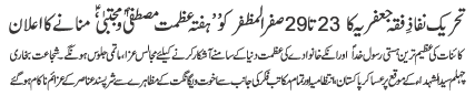 | ISLAMABAD, October 22: Tehreek Nafaz e Fiqh e Jafariya announced the observation of Hafta e Azmat e Mustafa O Mujtaba from 23-29 Safar al Muzafar | |||