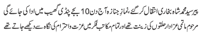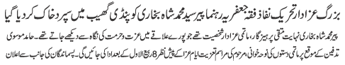 | ISLAMABAD, October 16: The chief organizer of Tehreek e Tahafaz e Wala O Aza HUrmat e Sadaat, Makhdoom Nazakat Naqvi passed away | |||